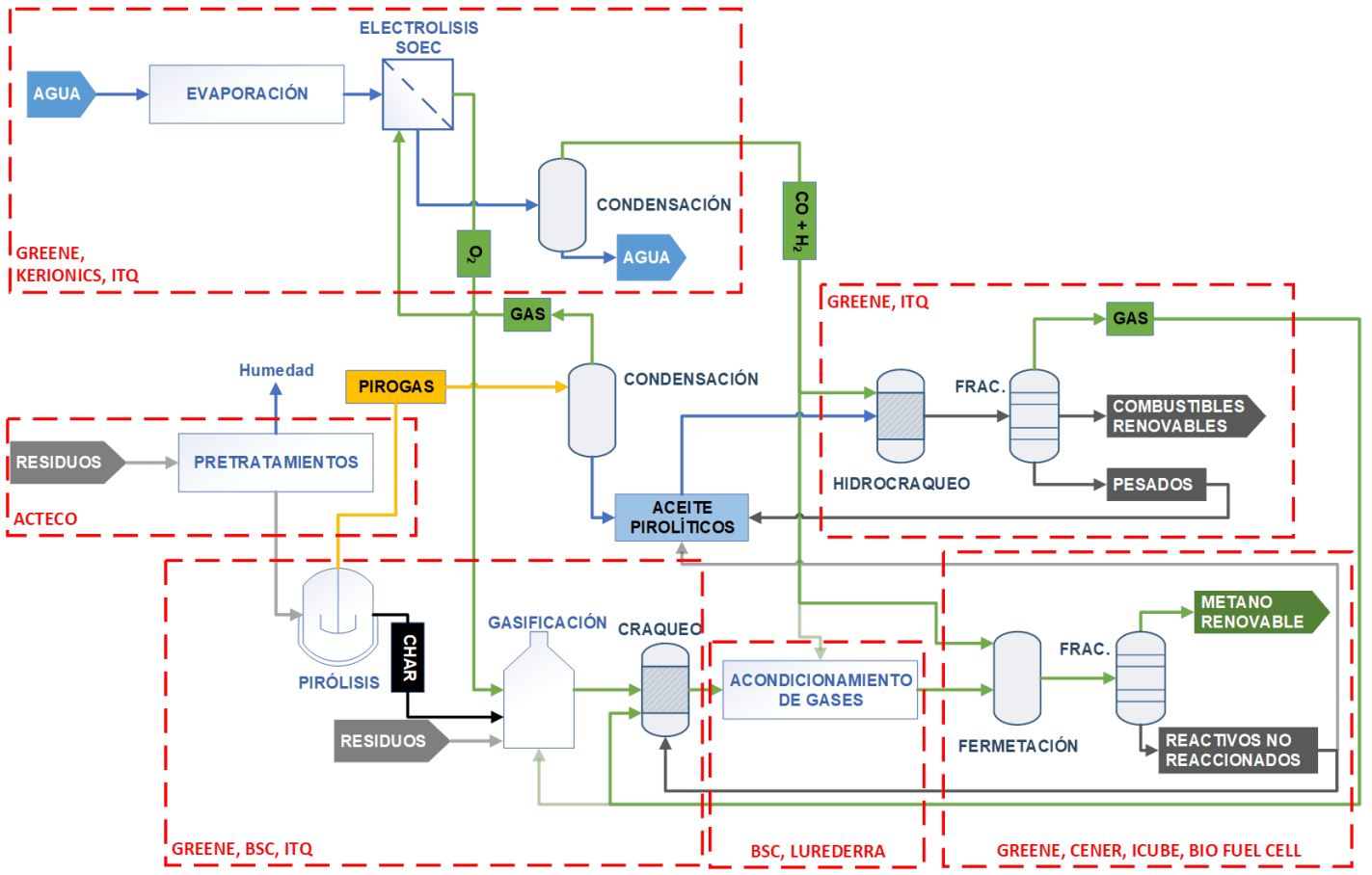 ➡️ The ALMAGREEN project aims to create a flexible and sustainable system for the production and storage of renewable energy from various waste materials. Using technologies such as pyrolysis, gasification, fermentation and SOEC electrolysis, these wastes will be transformed into methane, hydrogen and renewable liquid fuels. A key challenge is the development of a 500 W SOEC stack, capable of reversible operation to produce H2, O2, syngas and oxy-combustion, led by Kerionics.
